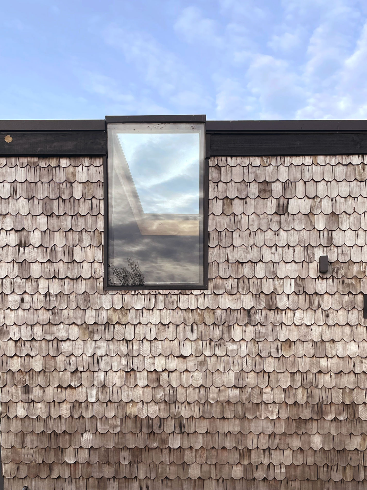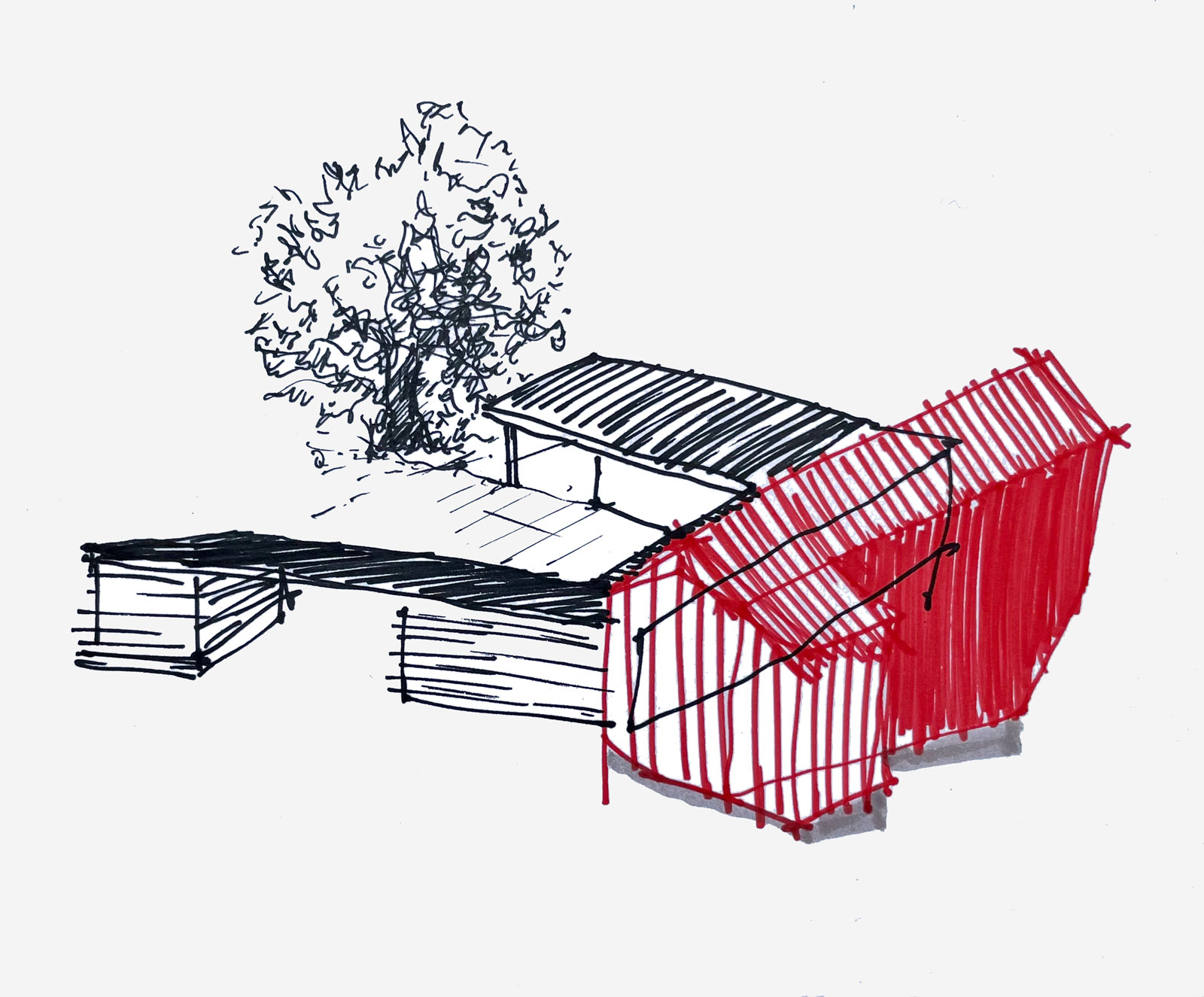 Un gran zócalo de hormigón, recorre todo el primer piso, marcando el nivel del acceso, acusando el cambio de nivel y la condición vertical de habitar en la ladera. El programa se desarrolla en dos volúmenes tangentes, uno más público y horizontal en torno a un patio tranquilo y protegido del viento, el otro privado y vertical, bien orientado al sol para ganar toda su energía y las magníficas vistas que dan la altura.