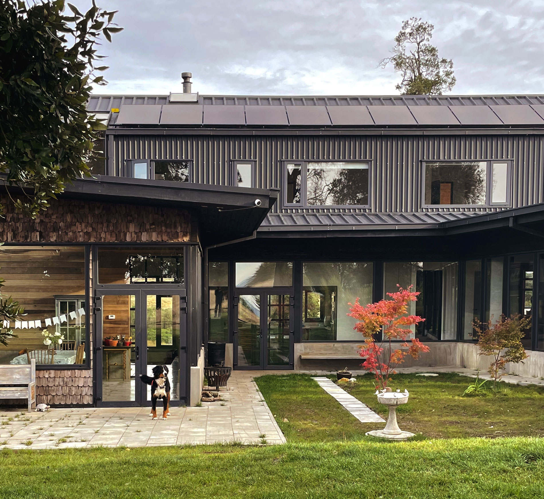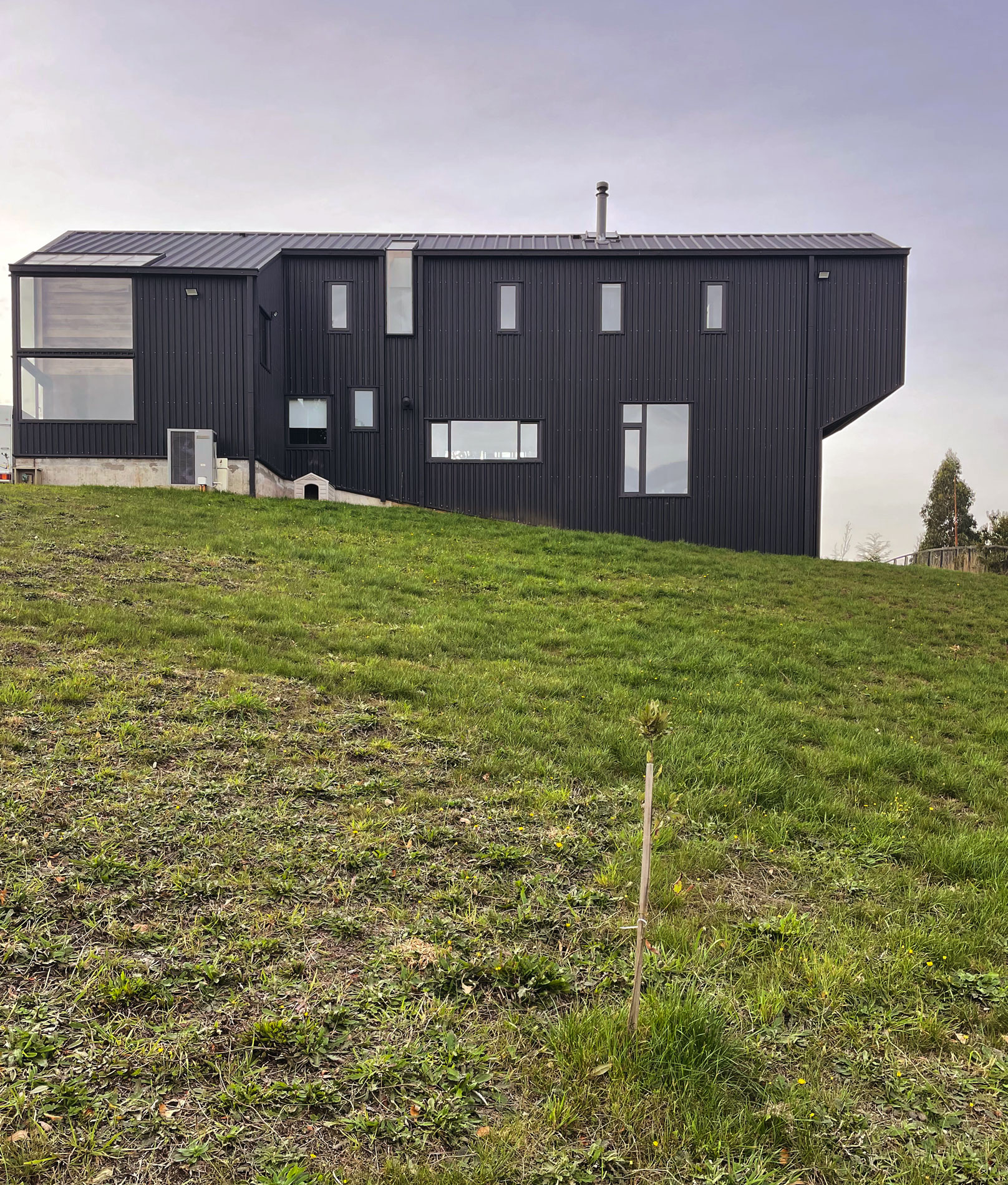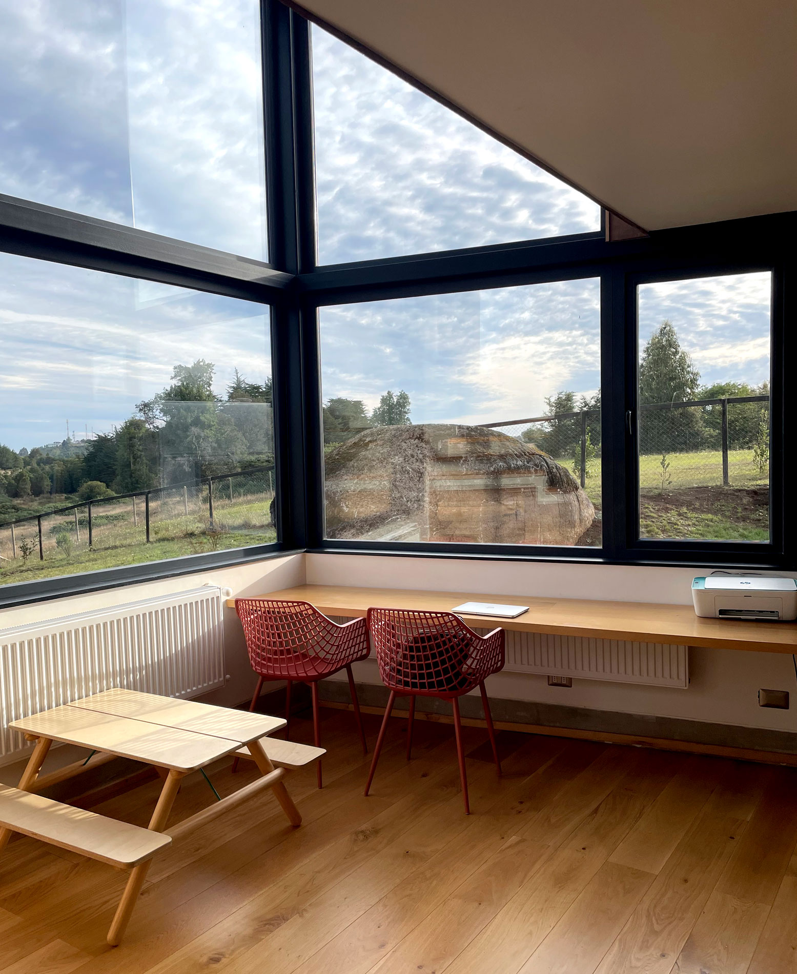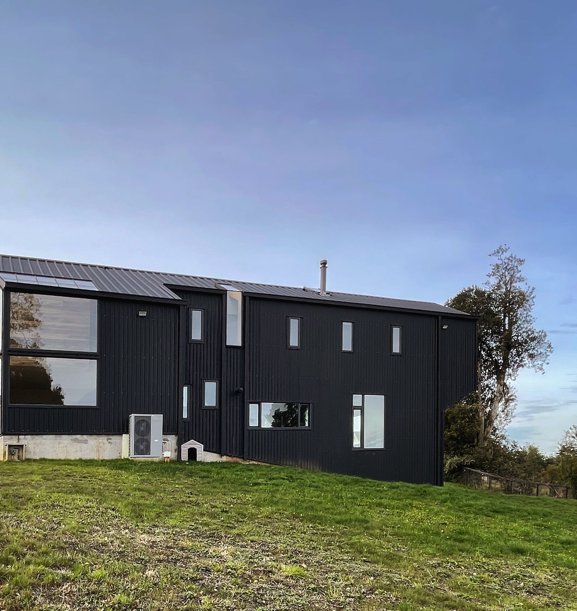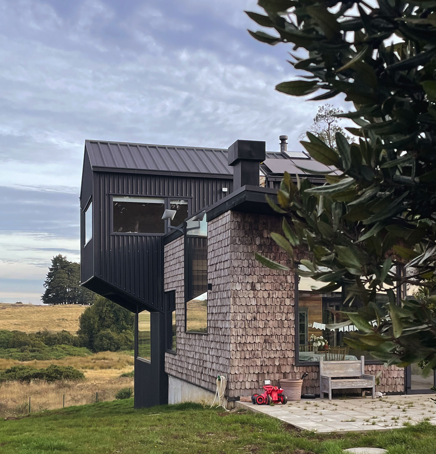 La casa Carpintero recibe el nombre de los carpinteritos que anidan temporalmente en los grandes lingues del lugar, ubicamos la casa escondida del camino, al borde de la ladera que baja al sur, para ganar la vista a los volcanes y el lago.