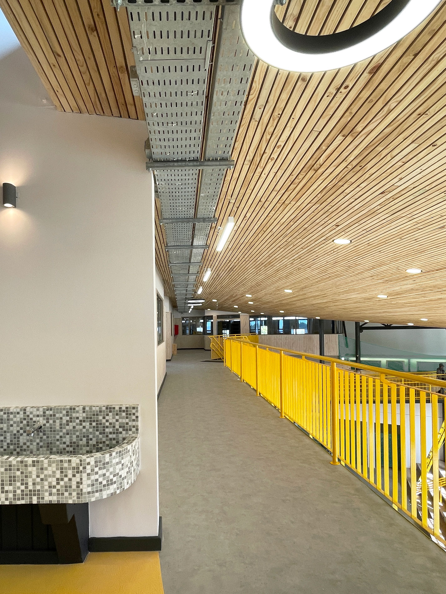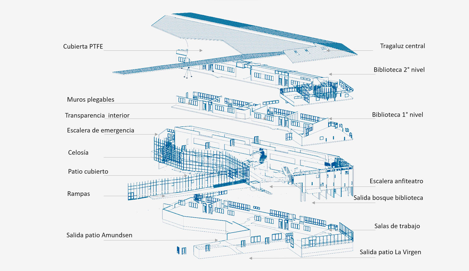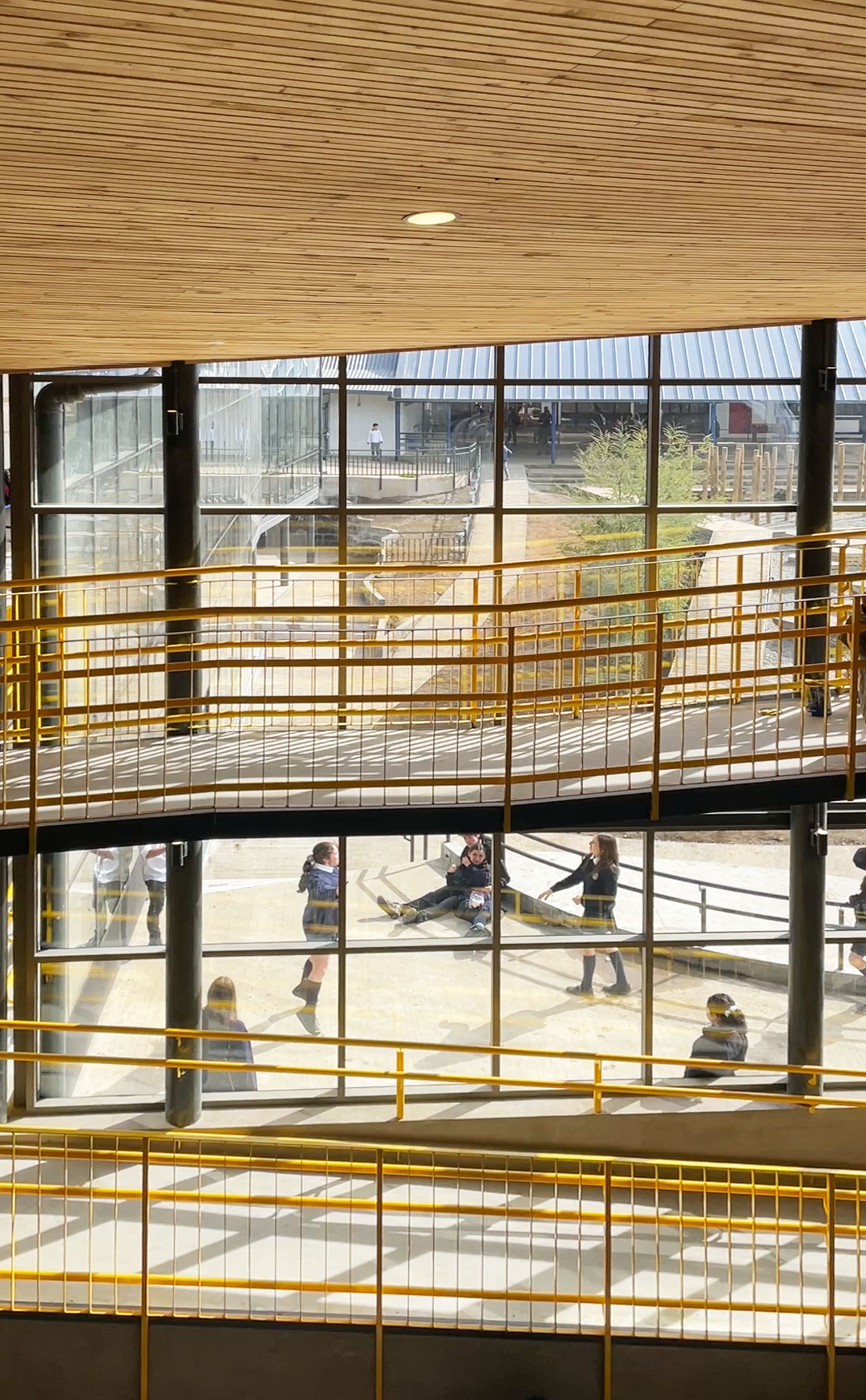 «Los detalles, no son los detalles» Cada decisión y elemento contiene un mensaje directo o subconsciente. Nos relacionamos y entendemos el mundo por nuestros sentidos y en un espacio pensado para la exploración y la creatividad, los niños absorben todo lo que los rodea y lo interpretan para su mundo. De todos los sentidos, nuestro mayor cuidado lo ponemos en el interoceptivo, que nos indica nuestro grado de confort con el entorno, (temperatura, luz, ruido, texturas, olores, colores, materiales, etc.) Buscamos crear las condiciones optimas naturales y emocionales para facilitar el aprendizaje. Crear condiciones de bienestar, multiplica la disposición para explorar, colaborar y aprender. En esta etapa de ampliación, se suman salas de clase flexibles y conectables, interiores y exteriores, distintos patios cubiertos cerrados y abiertos y las bibliotecas con sus destinitos espacios y usos posibles, con muebles, colores, texturas y rincones estimulantes para la lectura y el estudio. Todo conectado por escaleras y rampas que conectan los niveles y dan espacio para la conversación, la respiración y la integración.