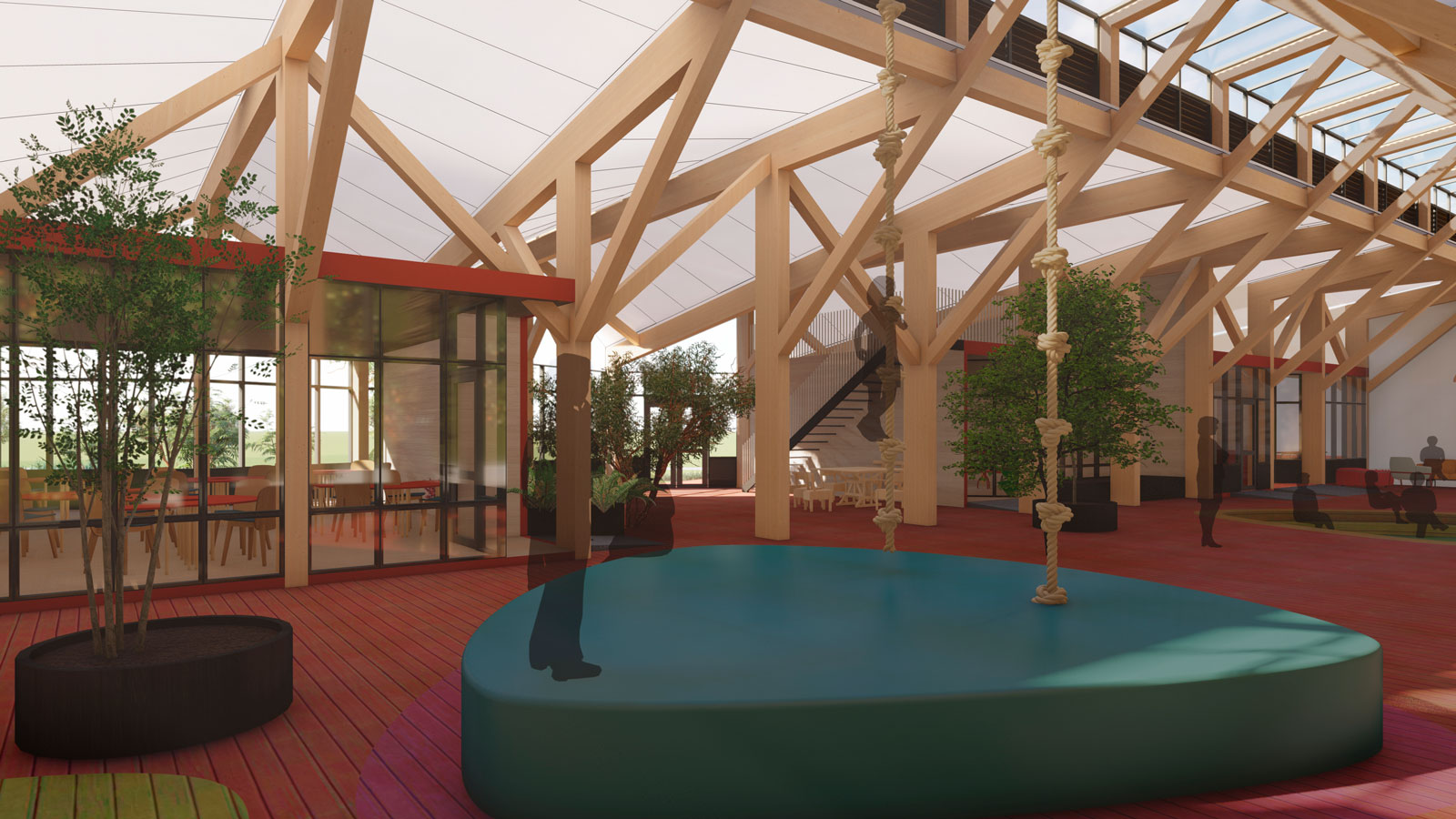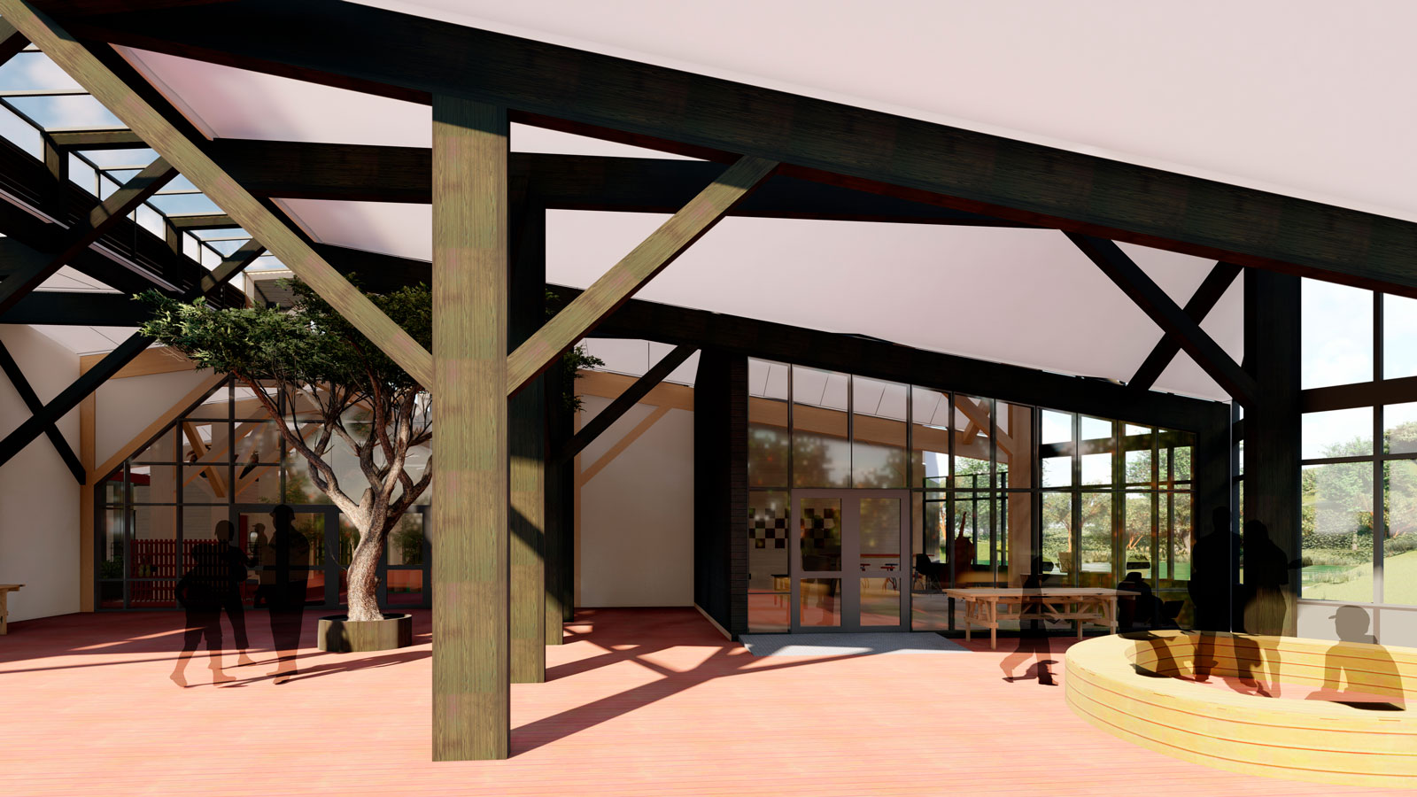 Membrana PTFE, aporta confort, un grado de transparencia, autolimpiable y ayuda a purificar el aire. Los espacios de máxima temperie, prefabricados en paneles Rootmann y vigas I-Joist, permiten rearmar el programa y apoyar empresas locales, reduciendo además al máximo los residuos en terreno.